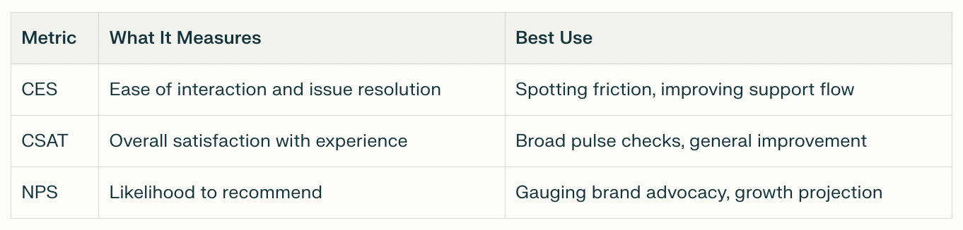 CES stands alongside CSAT (Customer Satisfaction Score) and NPS (Net Promoter Score), but it adds unique value: